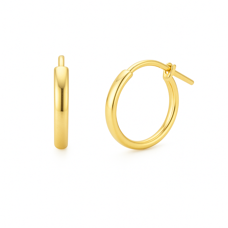 Su pestillo trasero seguro permite un uso diario sin esfuerzo, manteniéndose firmes y cómodos durante todo el día. Su diseño delgado y pulido los convierte en una pieza versátil, ideal para quienes buscan aros de oro 18K pequeños, livianos y con un acabado impecable.