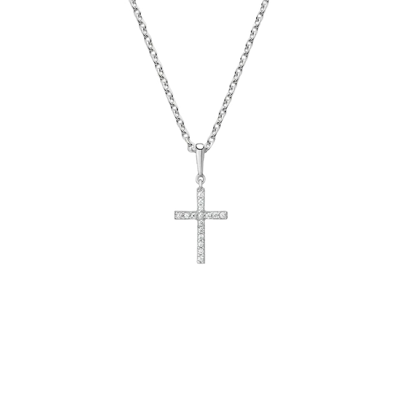 Colgante en forma de cruz elaborado en plata, realzado con diamantes engastados en garras compartidas, que aportan brillo y delicadeza a un diseño lleno de significado.